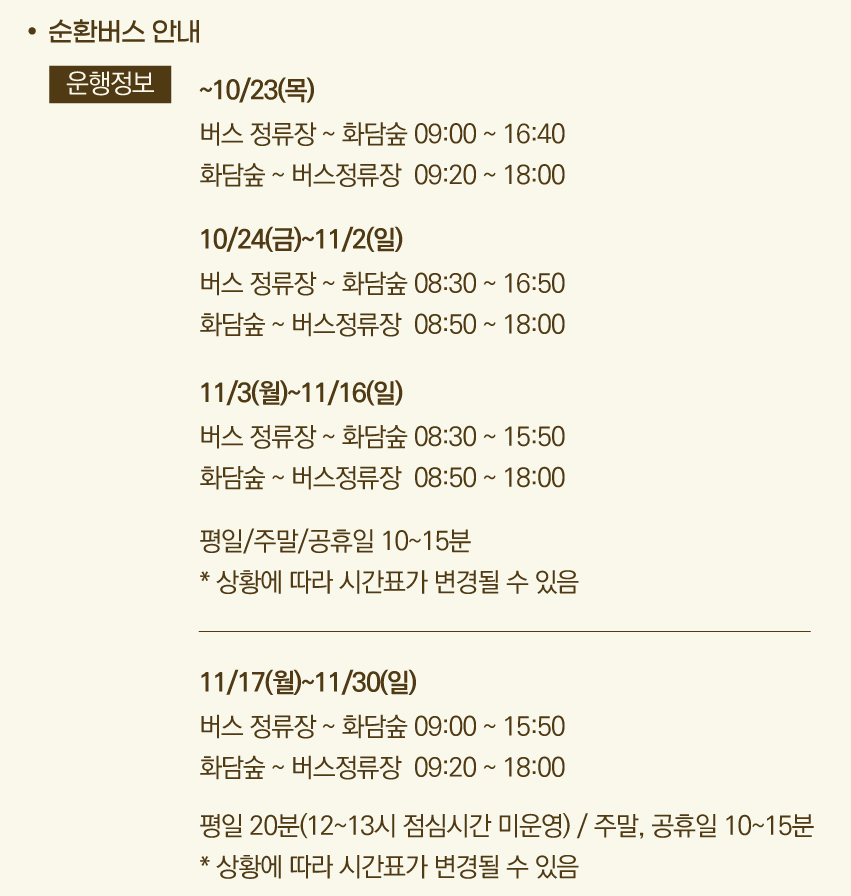 | 기간 | 버스정류장 → 화담숲 | 화담숲 → 버스정류장 | 운행 간격 |