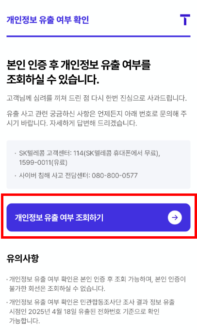 내 정보가 유출됐는지 걱정되신다면, SKT에서 만든 전용 조회 페이지에서 바로 확인할 수 있습니다.